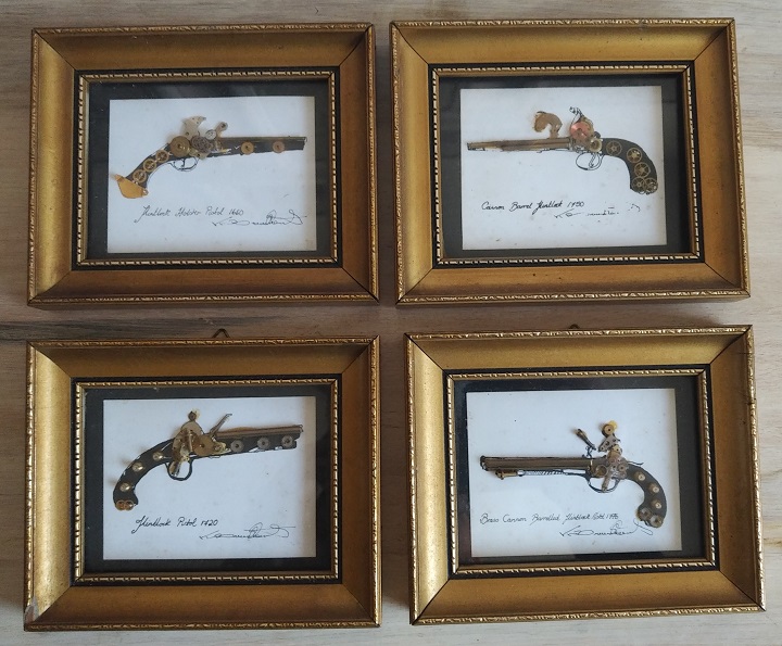Sie bieten auf vier Bilder aus der Werkstatt des englischen Künstlers Ken Broadbent, es handelt sich um von ihm und seinen Mitgestaltern von Hand gefertigte Unikate aus Uhrenteilen. Hergestellt in den 1960ziger Jahren, waren diese Bilder schon damals recht kostspielig in der Anschaffung und ein skurriler Blickfang. Echholzrahmen mit Glasscheiben, welche wie kleine Schaukästen Collagen aus Teilen von mechanischen Uhren umschließen. Die Teile stammen aus den sich in den 1960ziger Jahren im Niedergang befindlichen englischen Uhrenmanufakturen. Jedes Bild trägt auf der Rückseite ein Echtheitszertifikat. Format ca. 11,5 x 14,5 cm. Die Bilder wurden von mir vor über 20 Jahren erworben und lagen seit dem nur in einem Schrank, da ich nie einen würdigen Platz dafür gefunden habe, der vormalige Besitzer hatte sie seit den 1960ziger Jahren an der Wand hängen, weshalb sie stärkere Alterungsspuren in Form von Verschmutzungen (Staub) haben, teilweise haben Uhrenteile etwas auf das Trägerpapier abgefärbt, an einem Bild ist der Rahmen an einer Ecke beschädigt (Bild unten links, linke untere Ecke). Die Bilder sollten geöffnet und gereingt werden.