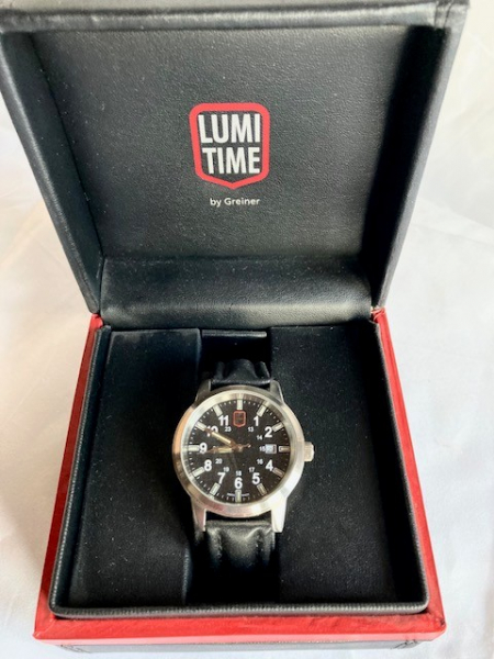 Armbanduhr Lumi Time by Greiner, Zifferblatt hat einen Durchmesser von 4,5 cm, mit Datumsanzeige, Zeiger und Stunden leuchten im Dunkeln. Die Uhr wurde nicht getragen, und hat ein Lederarmband.