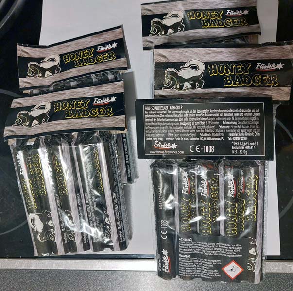 Biete hier ein Konvolut von 5 Pack Honey Badger Schallerzeuger Klasse P1 vom Premium Funke. oft ausverkauft. Ganzjährig ab 18 zu erwerben. Achtung: KEIN Silvesterfeuerwerk, daher erlaubten Verwendungszweck beachten. sie kaufen 5 Pack also 25 Stück pro Gebot