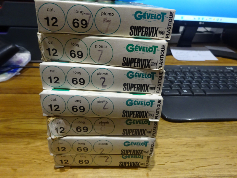 70 Schrotpatronen Gevelot Supervix 180 - 36 gr. Ladung- SAchrotgrößen 2,4 bis 3,5mm, siehe Foto und mein egun