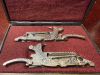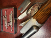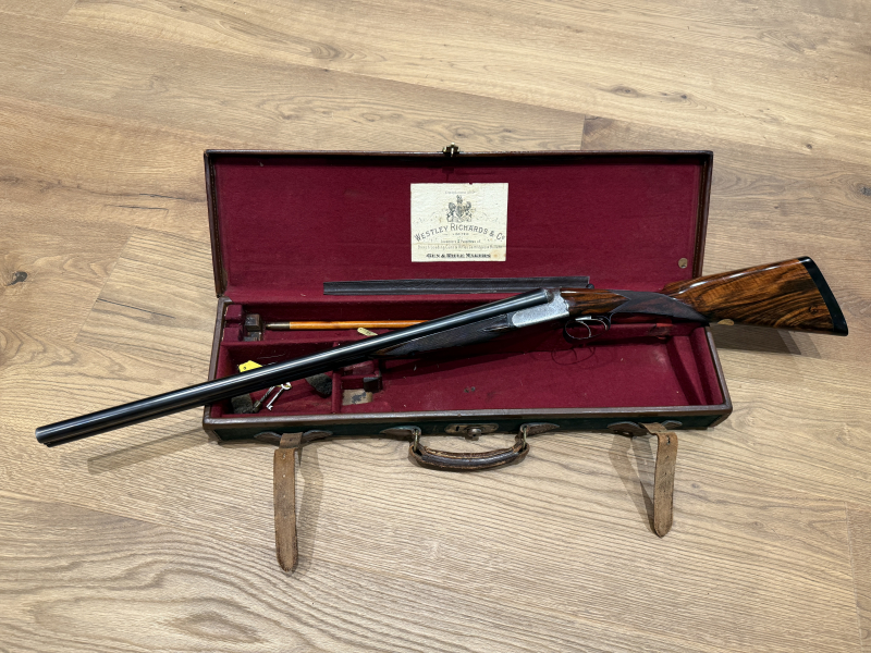 Doppelflinte Westley-Richards Droplock mit Reserveschlossen. Das Droplocks-System ist selten. Es weist gegenüber dem Anson & Deeley-System weniger Bohrungen auf und ist somit besser gegen Wassereintritt bei Regen geschützt Seine große Stärke ist aber der schnelle Wechsel eines Schlosses bei einem Defekt. Allerdings werden nur sehr selten die originalen Ersatzschlosse mit Angeboten. Das Anfertigen dieser Schlosse alleine dürfte bei ca. € 10.000 liegen. Kaliber 12/70. Chokes Zyl. und 1/4. Lauflänge 65 cm. Läufe blank. Mit Ejektor. Doppelabzug. Automatische Sicherung. Verschluss auch ohne Vorderschaft ohne jegliches Spiel. Englischer Schaft (36,5 com) kürzlich aufgefrischt bei dem bekannten Schäfter Gernot Wather in Kochel am See. Originaler Koffer mit Schlüssel, der Koffer sollte neu überzogen werden.
