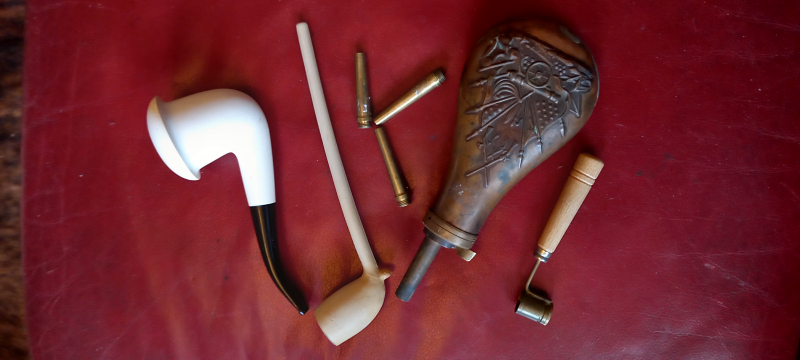Messingpulverflasche mit verschiedenen Aufsätzen, Stiefelknecht,