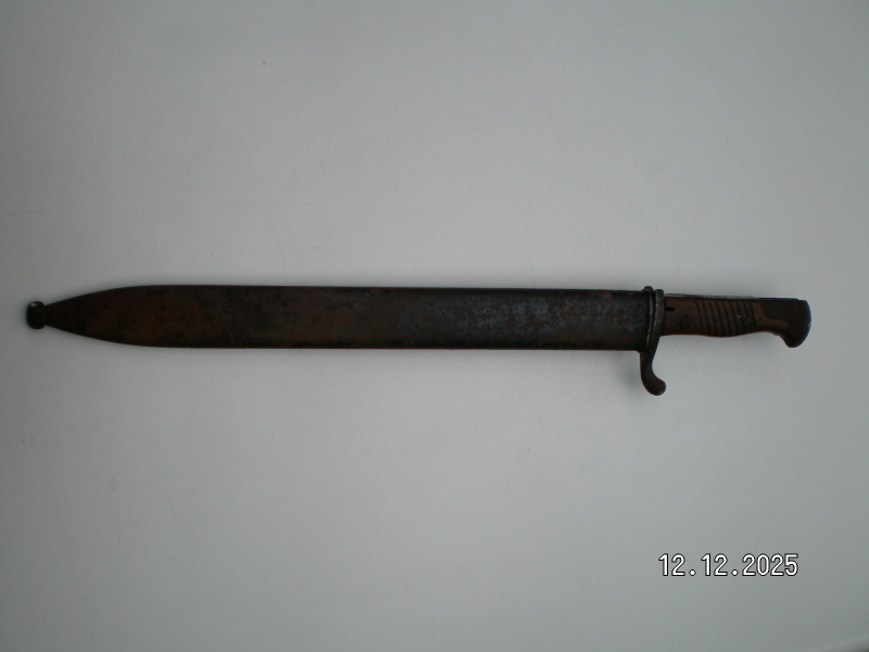 Zum Verkauf kommt ein Bajonett Seitengewehr 98/05 in der seltenen Ausführung vom weltbekannten Hersteller Fichtel & Sachs Schweinfurt. Dem Hersteller für Stahlwaren von besonderer Güte und exzellenter Qualität. Länge ca. 52 cm. Zahlreiche Stempel, Marken und Prägungen. Auf der einen Klingenseite der Schriftzug Fichtel & Sachs Schweinfurt, auf dem Handschutzbügel die tiefe Prägung der Zahl 1009 deutlich zu sehen. Auf dem Klingenrücken ein "K", darüber eine Krone, es folgt die Zahl 17, dann kommt ein Buchstabe ähnlich dem des Englischen Pfund Sterling, dann folgt wieder eine Krone. Am Scheideneingang links wieder das "K" und darüber die Krone, rechts ein "F"