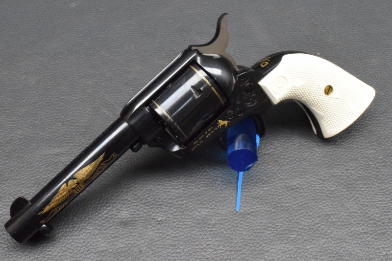4,5" Lauf, Rahmen, Lauf & Rahmen mit schöner leichter Gravur, mit Goldeinlagen, SA Abzugssytem, starre Visierung, 6-Schuss Trommel. weiße Kunststoffgriffschalen mit Colt Logo.