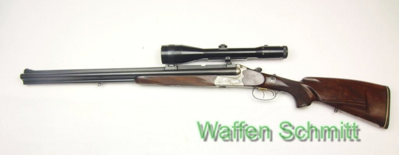 Sie bieten auf einen Vierling von Franz Sodia aus Ferlach im Kaliber 16/70-.30-06-.22Hornet mit Einstewcklauf im Kaliber 5,6x50R Mag. im rechten Schrotlauf montiert mit Zeiss Zielfernrohr Diavari-Z 2,5-10x52 Abs.4 montiert mit Suhler Einhakmontage. 63,5cm Lauflänge mit Korn und ohne Visier (3 Läufe von innen ohne Mängel, der .22Hornet Lauf mit minimalem Rostansatz hinter dem Patronenlager), vernickelte Stahlbasküle mit Tiermotiven, Greener-Verschluß (absolut dicht), seitliche Greener-Sicherung, Umschaltung auf dem Kolbenhals, vergoldete Doppelabzüge, beide Abzüge mit Rückstecher, Nußbaumholzschaft mit bayerischer Backe und Doppelfalz, 1cm Gummischaftkappe, vernickeltes Schaftmagazin mit Arabesken-Gravur, Riemenbügelösen, Schaftlänge 36cm, Gesamtlänge 108cm, Gesamtgewicht 5,1KG. Gebrauchsspuren auf dem Schaft. Die Waffe wurde wenig geschossen. Guter Zustand!!!