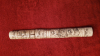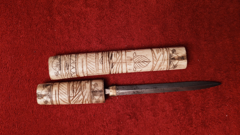 SCHÖNES SELTENES ANTIKES TANTO MIT BEIN GRIFF UND SCHEIDE BEIDSEITIG BESCHNITZT , KLINGE BEIDSEITIG SCHARF GESCHLIFFEN 17,5 LANG UND CA.2CM BREIT, GESAMTLÄNGE MIT SCHEIDE 29 CM