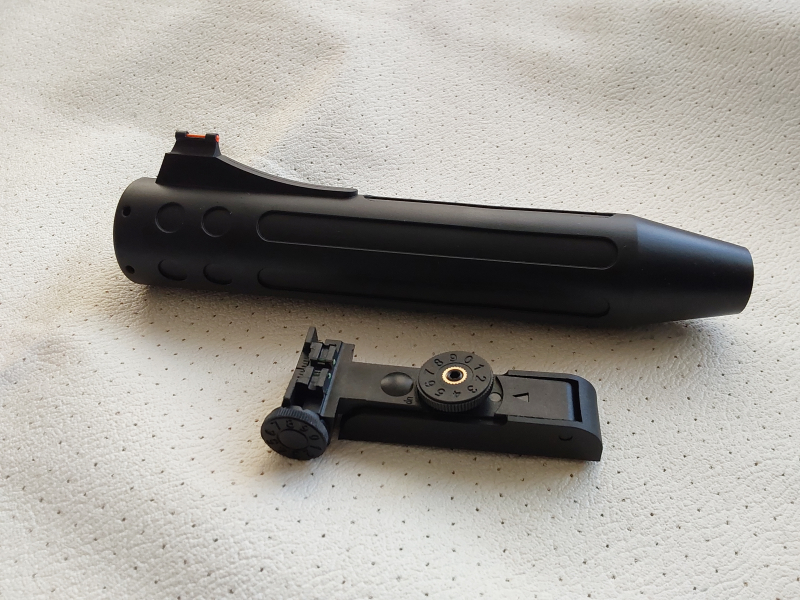 Biete hier eine komplette Visierung aus Kunststoff, mit integrierten Schalldämpfer, Länge: 170 mm, Außen-Durchmesser: 31,5 mm, der Innen-Durchmesser für Diabolo-Durchlass: 5,6 mm, für Luftgewehr-Läufe geeignet im Durchmesser: 15 mm. Die Kimme ist in Höhe und Seite einstellbar, der Lochabstand füt M3 - Befestigungsschrauben ist: 40 mm. Hersteller unbekannt. Zustand wie neu.