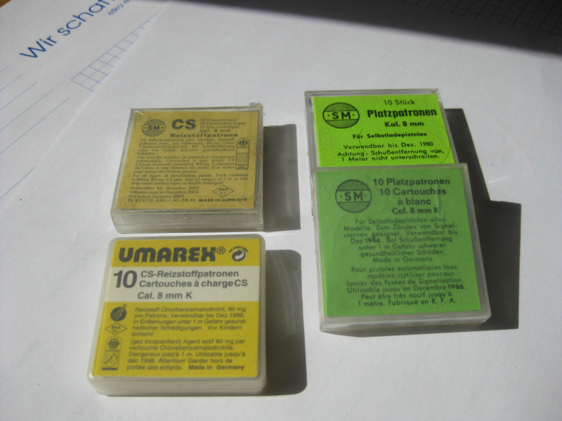 Angeboten werden 20 Platzpatronen von Fa SM im Kaliber 8mmK und 20 Reizstoffpatronen von Fa SM und Umarex. Die Patzpatronen sind aus den 80er Jahren, die Reizstoffpatronen aus Ende der 90er/ Anfang 2000. Die Munition wurde immer trocken aufbewahrt und ist teilweise noch original verpackt. Die Bilder sind Bestandteil der Auktion. Dieses ist ein Privatverkauf, daher keine Garantie oder Rücknahme.