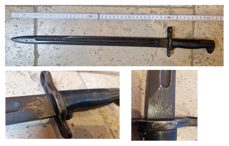Aus Sammlungsauflösung biete ich ein amerikanisches M1 Garand Bajonett / Seitengewehr in der seltenen Langversion aus der Zeit des 2. Weltkriegs, entworfen für den M1 Karabiner, der damaligen Standardwaffe der US Infanterie. Das Bajonett signiert / gestempelt „AFH US 1943“, auf der Klinge nummeriert 5542631. Der Zustand des Bajonetts ist auf den Fotos zu sehen und mit gut bis sehr gut (8-9/10) in Anbetracht des Alters zu bewerten. Es gibt nur minimale Gebrauchsspuren in Form der Alters-Patina, kein Rost o.a. Mängel und / oder Beschädigungen, alles ist gängig und nichts wackelt. Abgabe nur an Personen ab dem 18. Lebensjahr gegen Altersnachweis.
