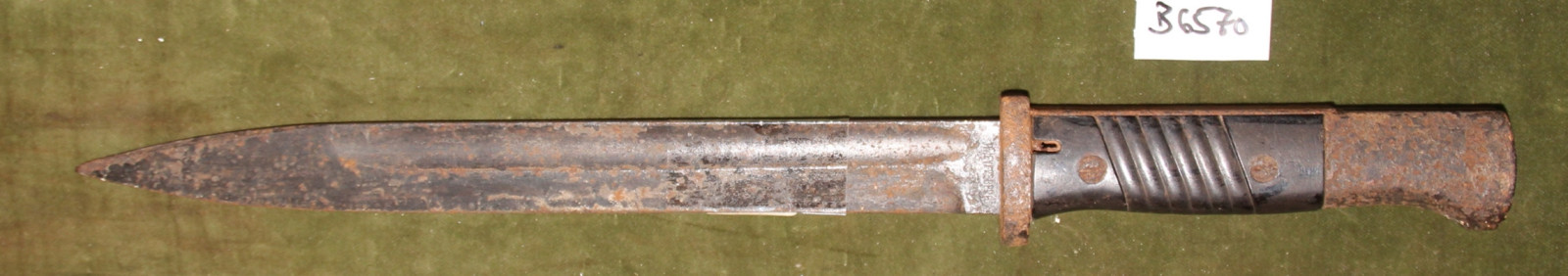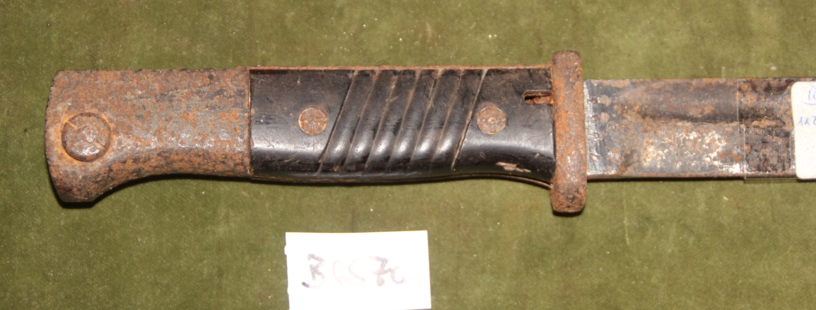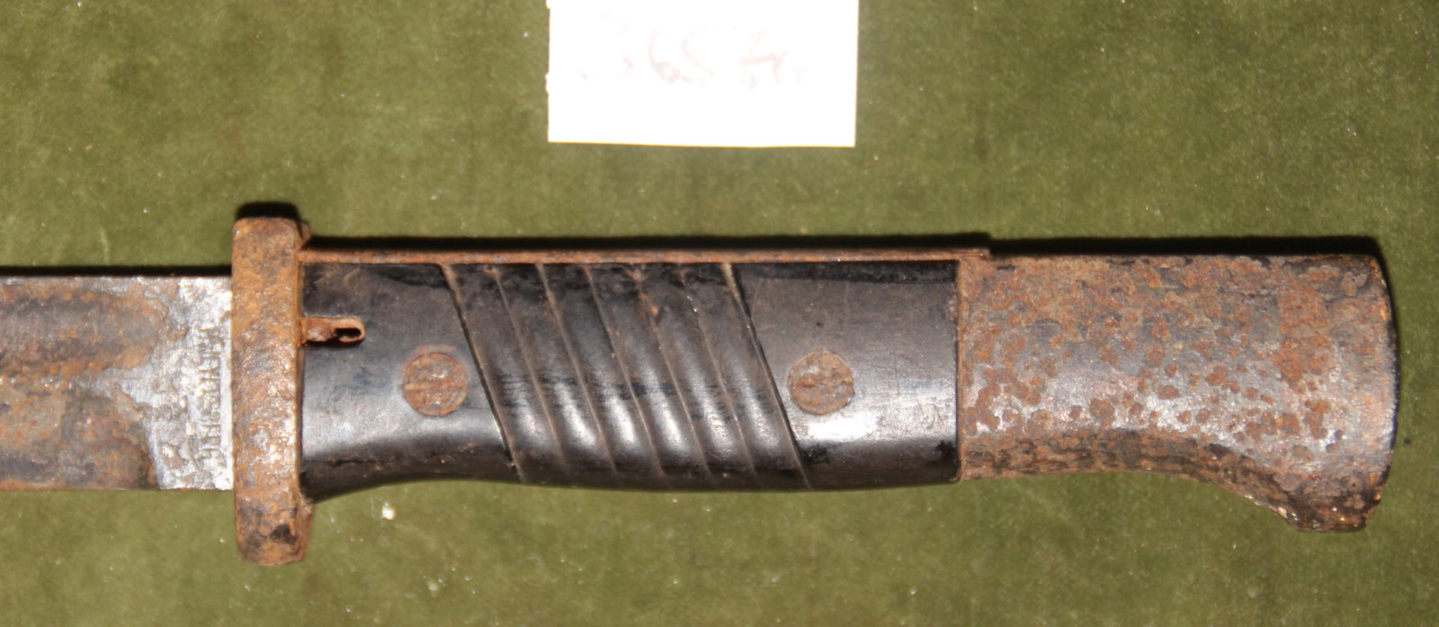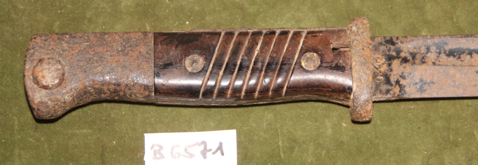 B6570 Deutsches Bajonett M 84/98 III, mit Bakelit-Griffschalen, ohne Scheide, angerosteter, narbiger Boden- oder Scheunenfund,