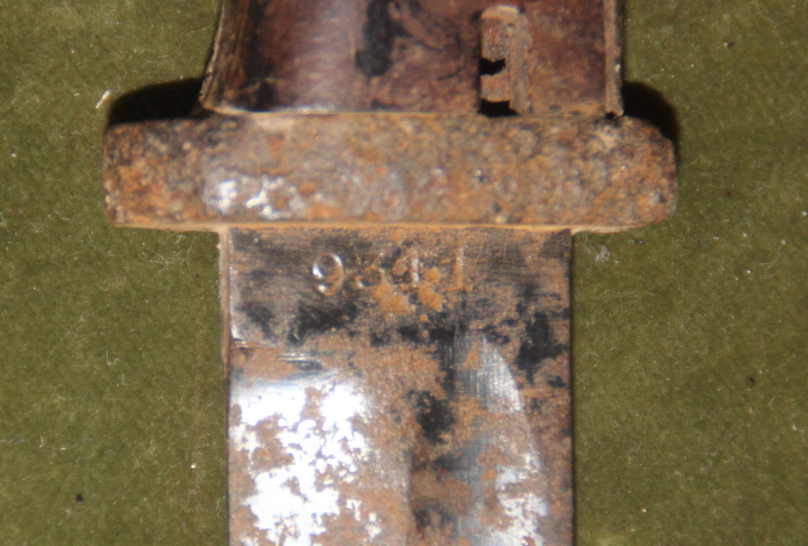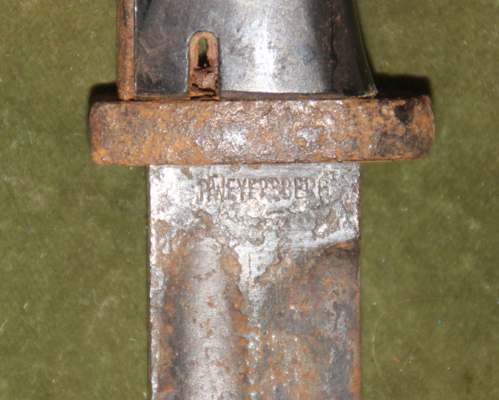 in unberührtem Fundzustand, die Griffschalen noch sehr schön, Fehlschärfe gestempelt: WEYERSBERG // 7863 c, weitere Stempel unter dem Rost nicht erkennbar.