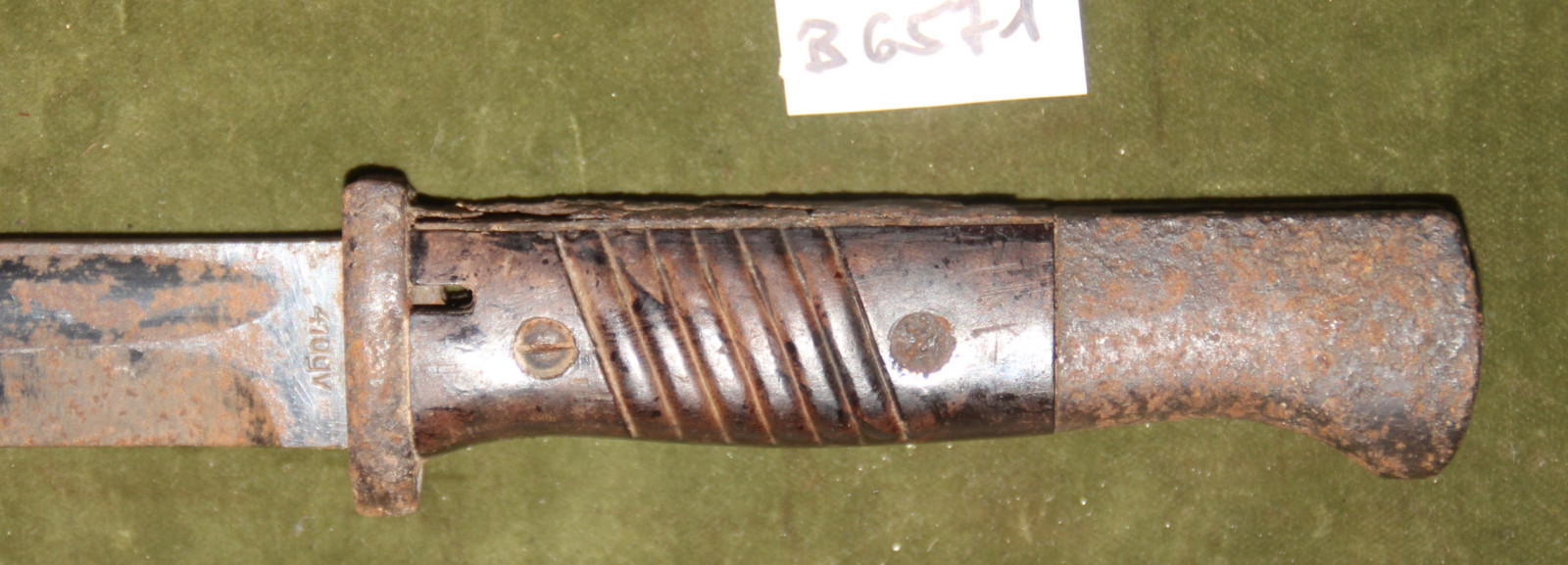 B6571 Deutsches Bajonett M 84/98 III, mit Bakelit-Griffschalen, ohne Scheide, angerosteter, narbiger Boden- oder Scheunenfund,