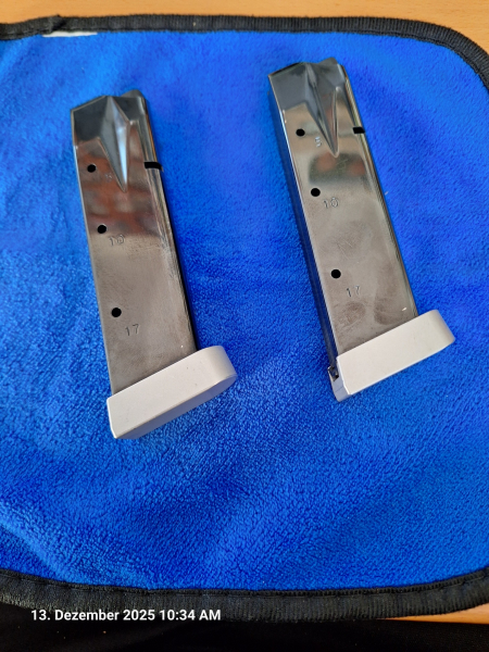 Sie bieten auf zwei neuwertige Magazine 9mm für eine Sig-Sauer X Six mit angegebener Kapazität von jeweils 17 Schuss.