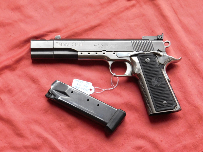 Pistole Peters Stahl Modell PLS mit Kompensator Lauf Kal. 45 ACP, 5 Zoll Lauf plus Kompensator, Lauf (Polygon) innen spiegelblank, eine super Matchwaffe, leicht und sauber auslösender Abzug, lange Sicherung, langer Verschlussfanghebel, Beavertail, TRT Matchvisier eben eine Peters Stahl Matchpistole. 1 Magazin dabei. Para Ordnance Griffstück doppelreihig. Gültiger Beschuss vorhanden. Die Waffe hat meiner Meinung nach leichte bis deutliche Gebrauchsspuren.