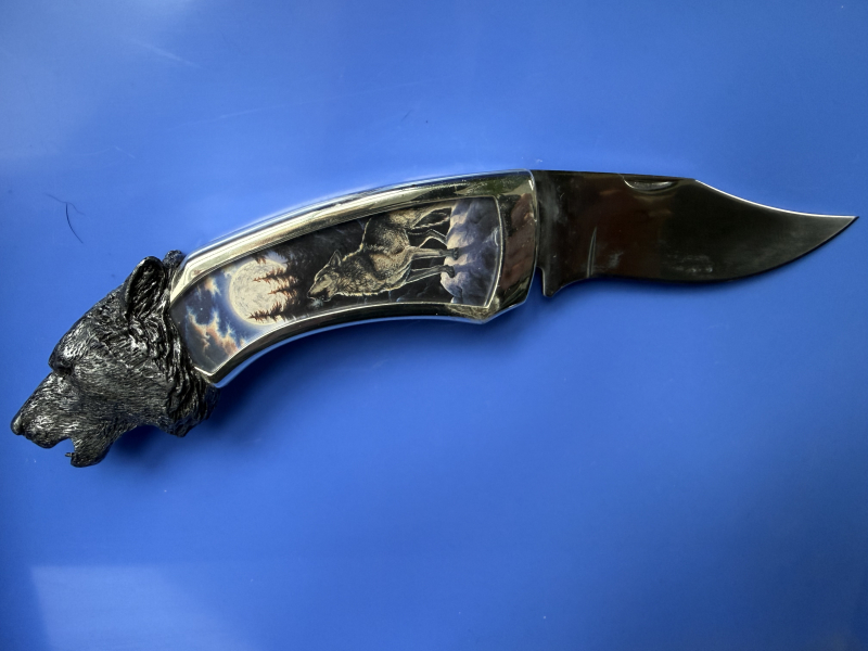 Franklin Mint Messer, mit Wolfskopf und schönem Wolfsbild