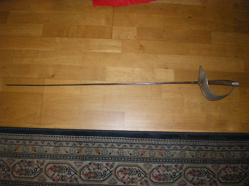 Gesamtlänge 101cm, die Klinge ist bruniert und gekehlt. Der Griff ist aus Holz mit Rillen. Keine Störungen, in einem selten gebrauchten Zustand.