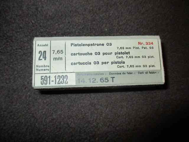 24 Pistolenpatronen 03 Nr. 334. Wohl 7,65 Para. Angaben sind auf dieser Schachtel dreisprachig. Seitlich steht noch für die Anwendung zum Öffnen der Schachtel: stossen / pousser / springere. Schachtel ist noch verschlossen. Kein Internationaler Versand.
