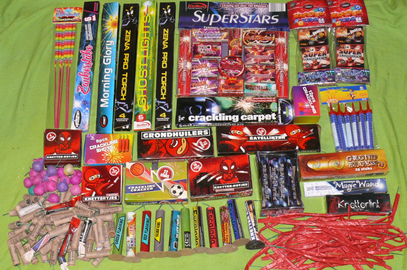 Eine Mega-Sammlung Jugendfeuerwerk, ca 40 Päckchen (natürlich alle voll), dazu 20 Fontänen und viele Knatterpeitschen, viele Crackling-Knaller und Knatterbälle – Wert: weit über 70,--€ !!!