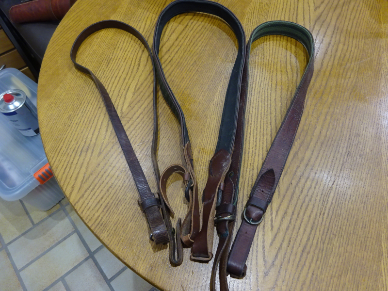 aus Jägernachlass: Konvolut 3 Leder-Gewehrriemen mit leichten Gebrauchsspuren mit unterschiedlichen Breiten und Mustern, günstig, siehe Fotos und mein egun