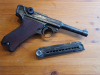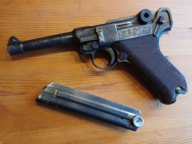 Pistole 08, byf 41, Wehrmacht. Kal. 9x19, Technisch 100% in Ordnung. Zustand mäßig. Nummerngleich inklusive des Magazins. Rechte Griffschale ergänzt weil bei Auffinden schlicht nicht mehr da. EWB notwendig, kein Verkauf/Versand ins Ausland, NO FOREIGN SALE OR SHIPPING. Privatverkauf.