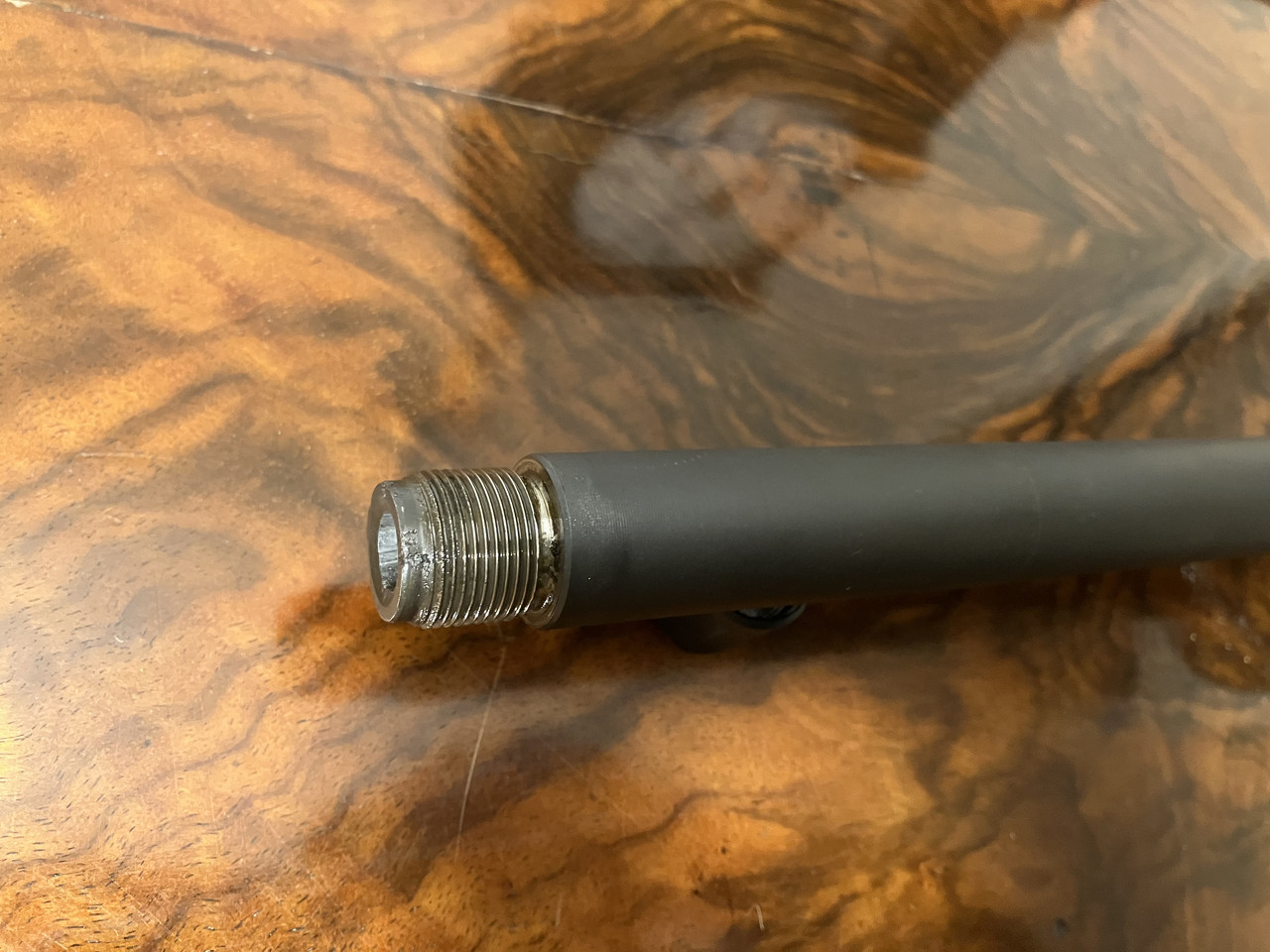 Wie auf den Fotos zu sehen ist, weist die Waffe grundsätzlich kaum Gebrauchsspuren auf. Die Mündung der Waffe wurde jedoch nicht gut gepflegt. Ich habe allerdings keine Beeinträchtigung der Schussleistung feststellen können, sodass es sich hierbei primär um einen optischen Makel handeln dürfte. Züge und Felder sind scharfkantig. : - )