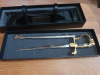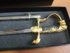 Länge 29 cm, Klinge aus Gehärtetem Material , goldfarbige Montur. In einer Präsentationsbox mit Ständer. Neupreis beträgt 70 Euro.