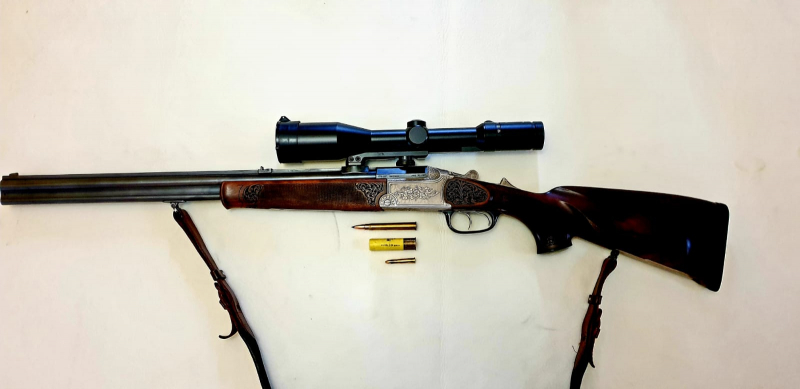 Der Bockdrilling Modell 880 in Luxus Ausführung. Fein einstellbare Direktabzüge.