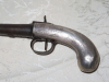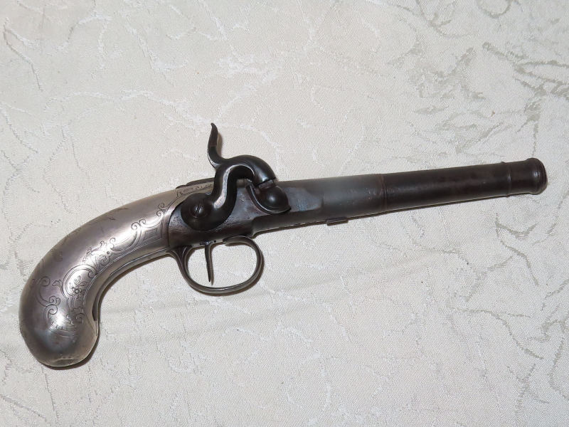 Leicht gravierter, perkussionierter Schlosskasten, an der Unterseite mit Abnahmen. Griff aus Weißmetall mit Blüten- und Rocaillegravuren