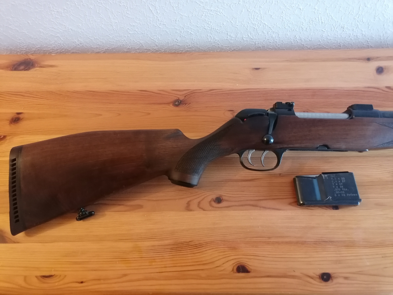 Dabei ist ein Original-Stahlmagazin (mit seitlicher Klemmfeder). Die Kimme läßt sich durch eine kleine Schraube leicht seitlich entnehmen, was dann auch Platz für ein Vorsatzgerät schaffen würde (wenn man es mag). Jedenfalls eignet er sich hervorragend durch seine kurze kompakte Bauform für enge Kanzeln.