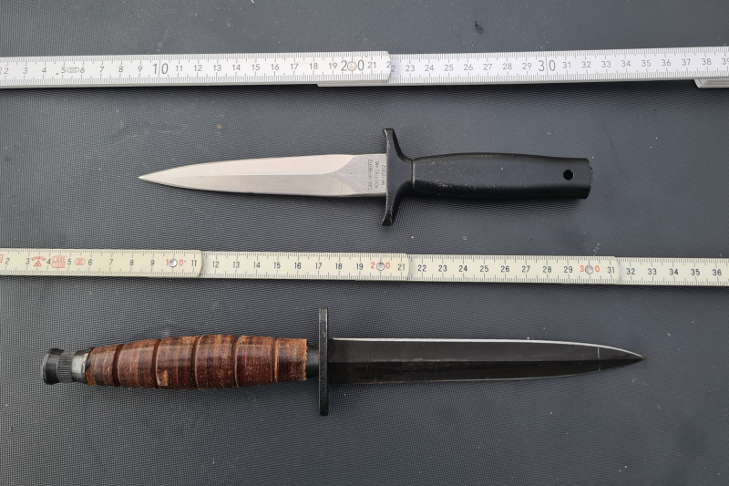 Der Dolch mit dem schwarzen Griff (wurde früher als sogen. "Stiefelmesser" verkauft) ist von der Firma Herbertz. Der andere Dolch (sieht etwas nach einem englischen Kommandodolch aus) hat nichts auf der Klinge stehen - bei diesem Dolch wackelt die Parierstange etwas.