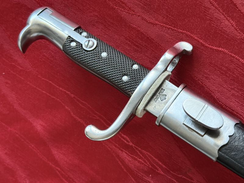 Kaiserliche Marine: Hirschfänger M1865/71 - 1. Matrosen-Division, Kiel.Blanke Klinge, an der Wurzel Herstellersignet von Weyersberg, Kirschbaum & amp; Co., Solingen, umseitig Punze "Erfurt" und Krone, auf der Fehlschärfe Abnahmepunze, Parierstange mit Truppenstempel, schwarze Griffschalen, in Lederscheide mit silbernen Beschlägen, mehrfach gepunzt.Zustand: TOP