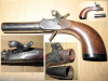 Originale kleine Perkussion Taschenpistole mit gravierten Schlosskasten, abschraubbarer Rundlauf im Kaliber 14 mm, Nussbaum Griffstück mit schwarzem Abschluss und voll funktionsfähigem Schloss, wobei der Hahn in zwei Stellungen hält und der Abzug beim Spannen herauskommt, mit Gebrauchsspuren.