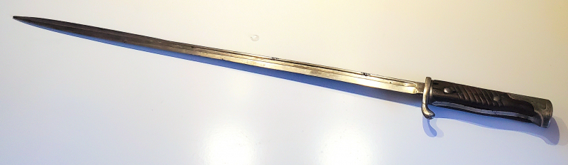 Seitengewehr SG 98/05 lang n.A. (ca. 1900). Steckrückenklinge mit Schör. Hersteller: Simson u. Co. Suhl. Klingenstempel: M. Auf der Parierstange ist 3744 eingeschlagen. Der Drücker ist beweglich. Klingenlänge: 52,5 cm. Gesamtlänge: 66 cm. Geteilte, hölzerne Griffschalen. Zustand siehe Fotos.