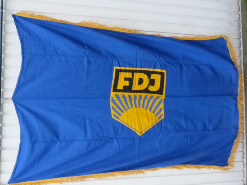 Fahne, F D J, Freie deutsche Jugend,Abmessungen ca. 1,20m x 1 80m mit Fransen,aus Lagerbestand.,Zustand siehe Fotos. Abbildung von beiden Seiten. Fragen an HBG GmbH Handelsgesellschaft Horst Schenkel, hbg@schenkelnet.de, 0177-8167772. KEIN EXPORT