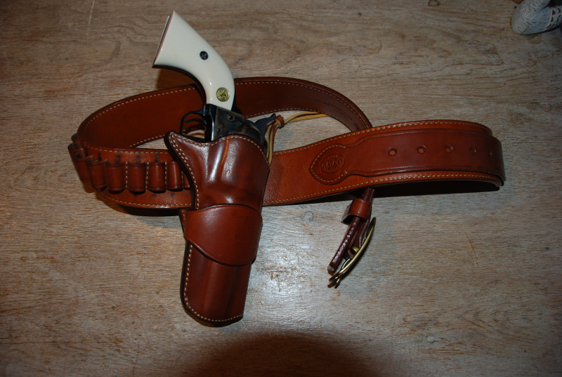 Der Gürtel ist zw. 80 und 90 cm verstellbar - also nichts für "kräftige " cowboys. Das Holster ist für SAA s mit einer Lauflänge von 4,3/4 Zoll.