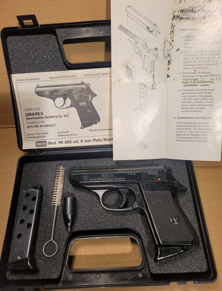 Sie bieten auf eine sehr gute PTB Pistole Reck Mod. PK 800 in 8mmK (Nachbau der Walther PPK) im Originalcase mit Reservemagazin, Trichter für Pyrotechnik, Putzstock und Bedienungsanleitung. Sehen Sie den Zustand selbst anhand der Bilder. Der Verkauf erfolgt in Kommission ohne Rücknahme, Garantie oder Gewährleistung! Bieten Sie einfach nicht, wenn Sie damit nicht einverstanden sind. Die Versandkosten gelten für ein versichertes Paket in Deutschland. Kein Versand ins Ausland!