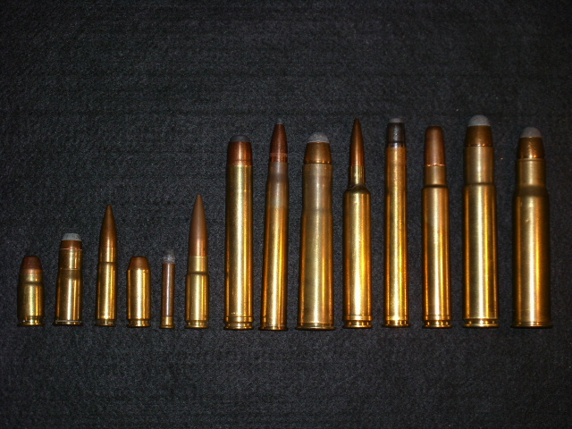 DEKO Sammlermuntion ohne Hülsenbohrung mit Klapperkugel, Foto - von Links : 400 Cor-Bon, 44-40 Win, 300 ACC BLK, 10 mm Auto, 5,6 mm Longue Portee, 308 Spectre, 450 Watts, 8x75 RS, 577/500 NE, 6,5-300 Weatherby Mag mit mini Hülsenmundriss, 9,3x80 R Collath, 375 ICL Kodiak, 505 Gibbs, 577-500 Hartmann & Weiss mit Hülsenmundriss,