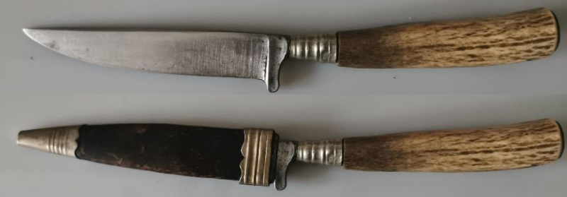 Abzugeben aus dem Nachlass ist für Sammler ein Jagdmesser mit Horngriff in der Stilett-Lederscheide zur Auktion.