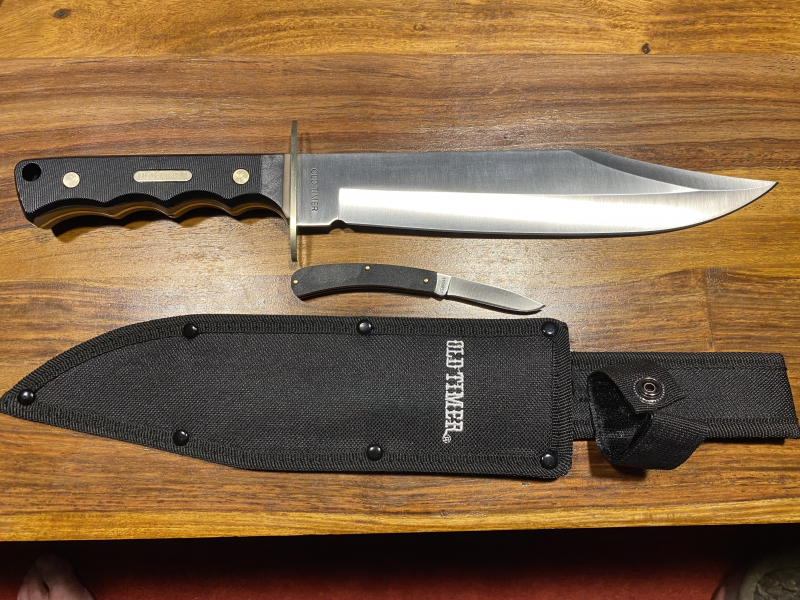 Biete hier ein Schrade Old Timer Messerset an. Das Set ist neu und absolut unbenutzt. Das Bowie ist 39,3 cm lang hat eine 25,5cm Klinge welche 3mm stark ist und aus 420er Edelstahl ist. Das Beimesser ist 13cm lang Klingenlänge 5,6cm. Beide Messer haben G10 Griffe das Bowie noch eine Nylonscheide. Bei Fragen bitte melden. Verkauf ist frei ab 18 Jahren und ohne Garantie oder Rücknahme. Altersnachweis bitte per Mail oder egun ID.