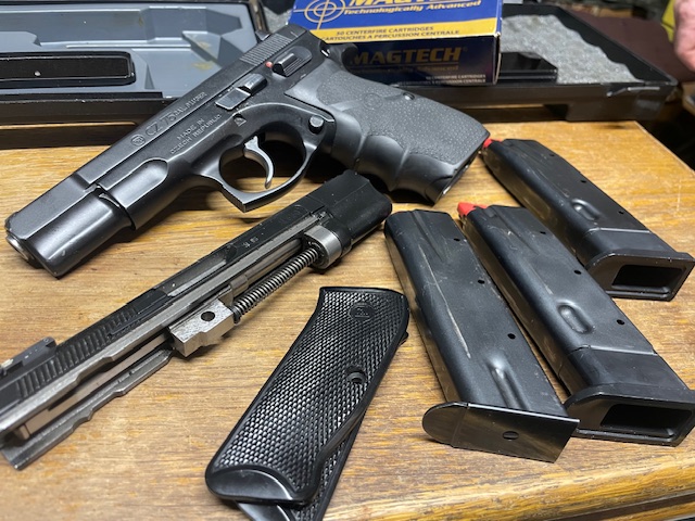 Ich stelle hier im Auftrag für einen älteren Jäger die abgebildete Pistole "CZ 75" mit Wechselsystem (Wechselschlitten) ein. Die Waffe kann somit im Kaliber 9mm Luger oder im Kaliber .22lf geschossen werden. Die Waffe befindet sich in einem sehr ordentlichen Zustand. Neben der Waffe mit den beiden Schlitten sind auch drei Magazine, zwei Kunststoffkoffer und ein paar Wechselgriffschalen dabei - wie abgebildet.