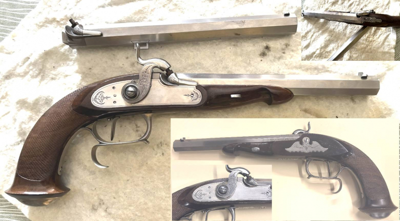 Verkaufe aus einen Nachlass eine gebrauchte Le Page Target Standard Perkussion Pistole von Petersoli mit zwei Läufe Kal. 31 & 44