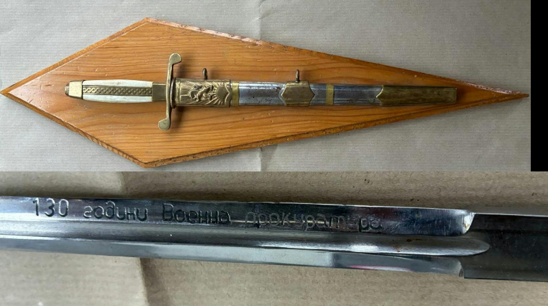 Sehr seltener bulgarischer Jubiläums-Korpsdolch mit einer auf der Klinge eingravierten Inschrift in bulgarischer Sprache „130 Jahre Militärstaatsanwaltschaft“. Ausgezeichneter, dem Alter entsprechender Zustand, ohne Mängel oder Beschädigungen. Auf einer Holzhalterung befestigt, zur Wandaufhängung geeignet.