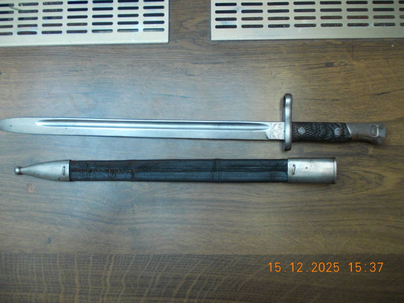 Verkaufe, aus Nachlass, ein gut 52cm langes Bajonett in Lederscheide-die Scheide wurde im Vorderbereich unfachmässig genäht. Die Nr.46595 und ein U unter der Seriennummer. Zur Herkunft, kann ich keine weitere Angaben machen.Verkaufe, nur in der BRD. Keine Garantie, noch Rücknahme.