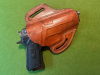 Pancake Holster mit 2 Gürtelschlitzen, das sowohl als Links- als auch- Rechtshand tragbar ist. Es besteht aus hochwertigem, schönen Braunleder, ist offen am Lauf, reiner Schnellzieher ohne jeglichen Verschluss und die Gürtelschlitzen, hier auf der Rückseite sichtbar