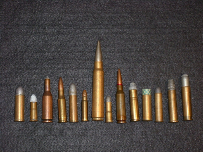 aus Sammlung Foto von links: 360 No.5, 297/250 Morris, 5,6x39 Vostok, 218 BEE, 310 Cadet Single shot, 5 mm Rem Mag, 8x61 Nor.Ord., 297/230 Morris, 5,45x39, 32-20 Win, 360 No. Schrot, 300 Rook Rifle, 32 W.C.F., 351 Win S.L.