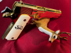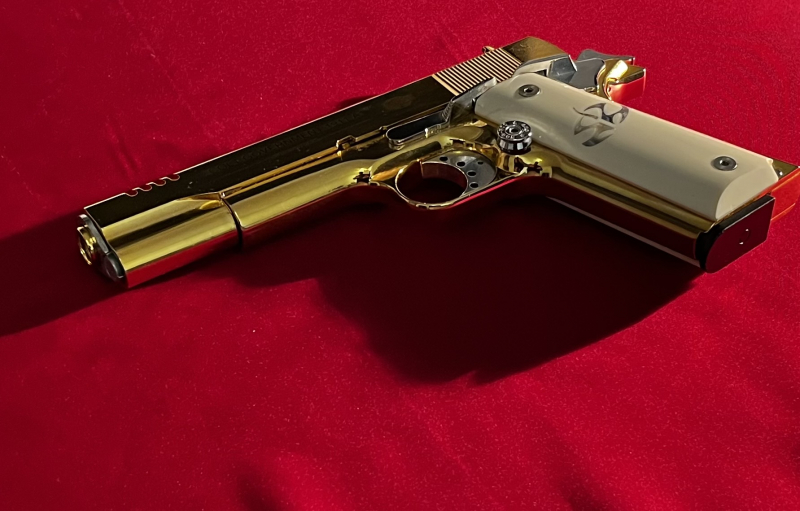 Veredelte Colt 1911 Gold, verchromte Bedienteilen, weiße Griffschalen, exklusives Sammlerstück