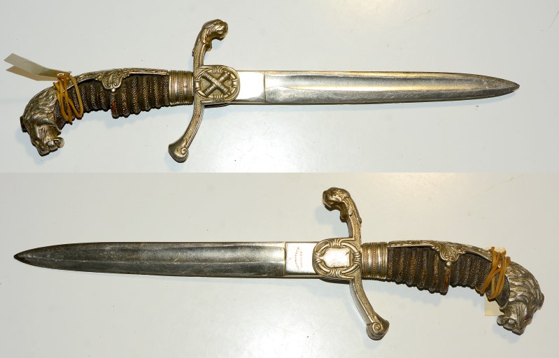 Französischer Behelfs-Gabendolch 1. Weltkrieg, hergestellt aus einem deutschen Kavallerie-Offiziers-Säbel, Klingenlänge 23,5 cm, Gesamtlänge 37cm, Hersteller des deutschen Säbels "Ewald Cleff Solingen", guter Zustand