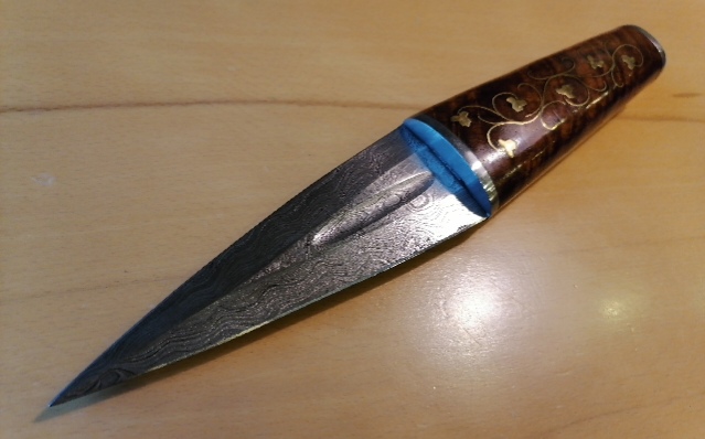 Damastmesser Dolch mit Edelholzgriff und Dekor Inlays. Wunderschönes Sammlerstück. Gesamtlänge 21 cm + Klingenlänge 13,5 cm.