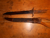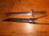 antikes Waidmesser, Jagdbowie, Klinge mit Sägerücken, Eisenparierstange, Hirschhorngriffschalen, Lederscheide mit Eisenbeschlägen und Trageleder, Klingenlänge 28,5cm, Breite 36mm, Dicke 7,5mm, seltenes altes Jagdmesser