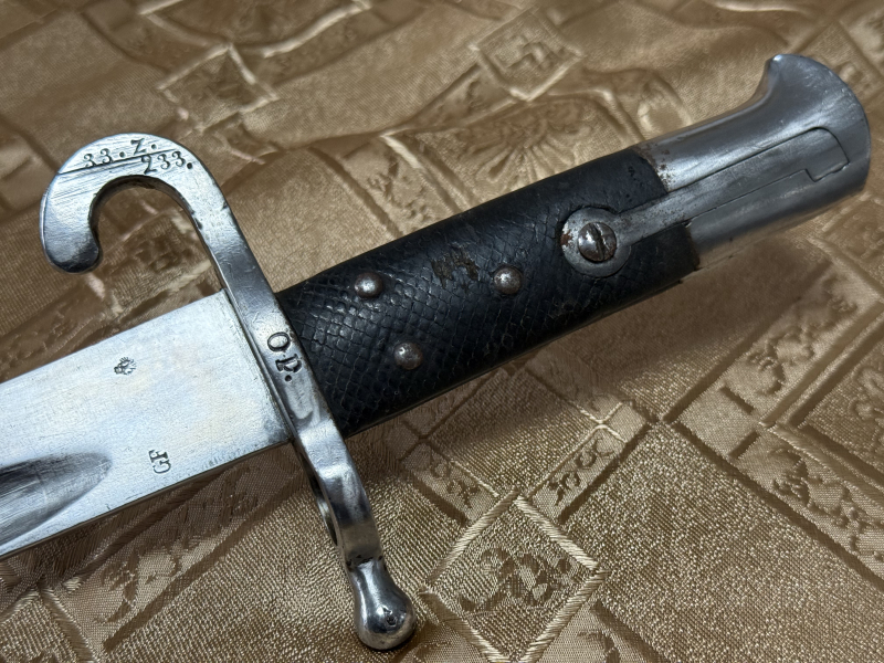 Österreich Säbelbajonett M1867 System Werndl - LEDERSCHEIDE. Österreich Säbelbajonett M1867 für System Werndl mit belederter Scheide; saubere Klinge mit Hersteller: "Ohlig und Söhne", auf der gegenüberliegenden Seite Armee-Abnahmestempel und "GF", ebenfalls auf der Parierstange mehrere Zahlen und Ziffern gestempelt, schwarze der geschwungenen Klinge angepasste Lederscheide mit Metallbeschlägen - ovaler Koppeltrageknopf, dreifach vernietete Griffschalen aus Leder - eine Scheidennaht ca. 30 cm offen, Drücker gängig, Klingenlänge: 58 cm; Eisenteile am Griff gereinigt; Gesamtlänge in der Scheide ca. 72 cm sehr guter Gesamtzustand - MIT LEDERSCHEIDE SELTEN! Versand Deutschland 8 Euro, Versand EU ca. 29 Euro je nach Land, bitte anfragen. Kann Ihnen gerne noch mehr Fotos senden, einfach anfragen auch in PDF Datei.